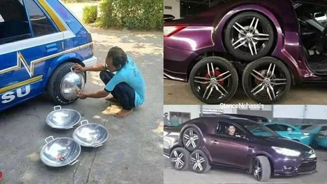 7 Potret Modifkasi Roda Mobil Ini Absurd Abis, Ada yang Pakai Wajan hingga Ember