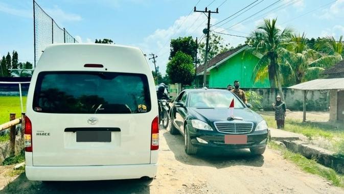 Jalan yang dilalui Jokowi tampak rusak parah. Terlihat sebagian jalan aspal sudah terkelupas.