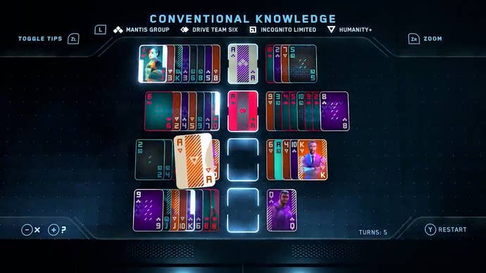 Terakhir, The Solitaire Conspiracy, yang dengannya Bithell Games berusaha mengubah permainan kartu klasik untuk pekerja pusat kontak yang bosan menjadi sesuatu yang apik dan bergaya yang dapat membawa narasi FMV, dengan power-up yang menambahkan elemen taktis pada strategi yang telah dihabiskan semua orang seluruh hidup mereka mengasah sementara bos mereka tidak melihat. Solitaire masuk ke Tron: Identity, sangat bengkok tetapi tetap dapat dikenali, sebagai mini-game defragmentasi yang berfungsi sebagai satu-satunya interaksi Anda dengan dunia game di luar percakapan. Dengannya, Anda dapat mengungkap kenangan dari NPC, yang aliran datanya telah terganggu oleh ledakan misterius di gedung penyimpanan The Grid.