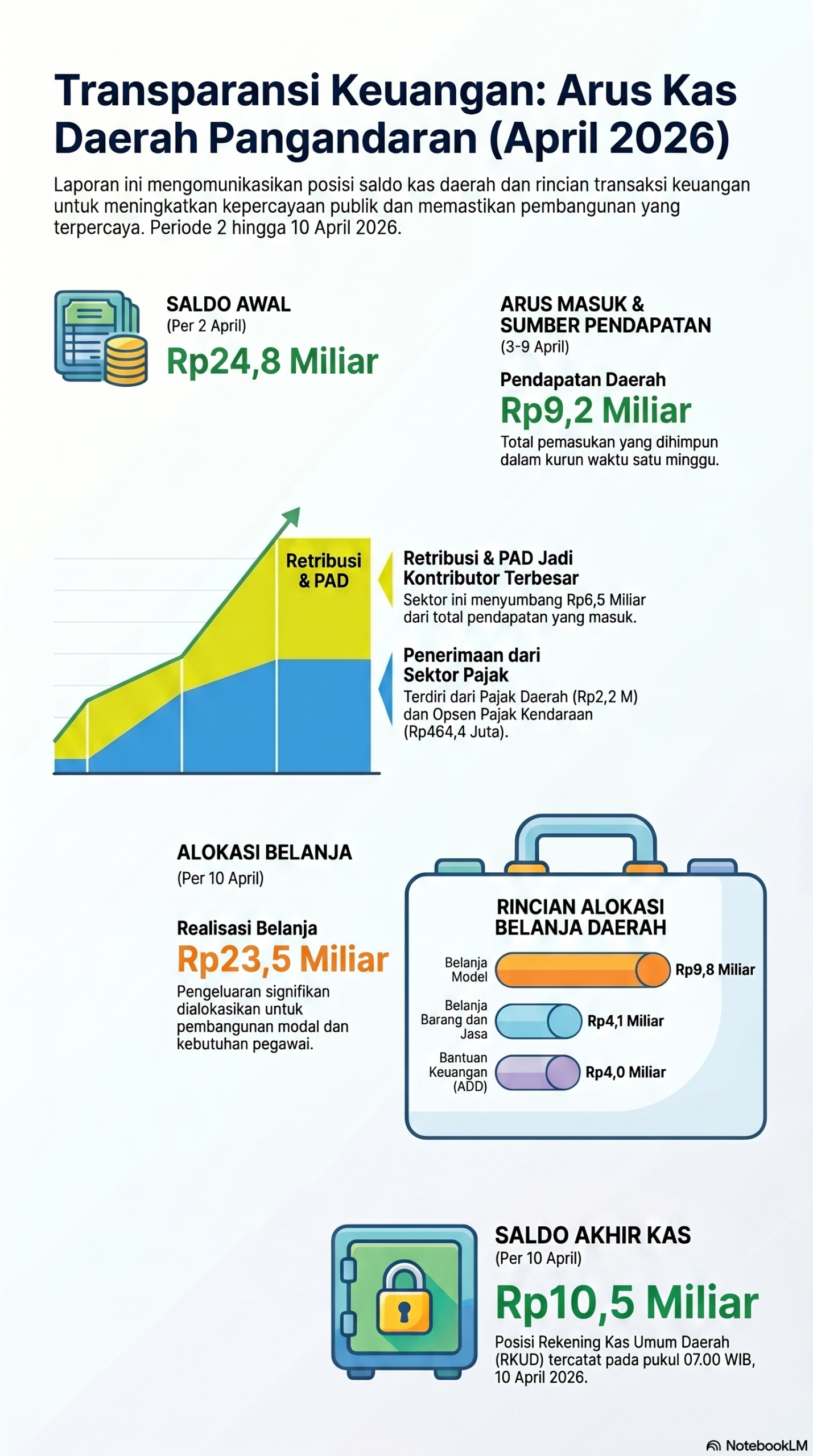 Langkah ini diambil sebagai wujud akuntabilitas publik agar masyarakat dapat mengawal langsung jalannya pembangunan di kabupaten pariwisata tersebut. Berdasarkan data yang dirilis, saldo kas awal RKUD Pangandaran pada Kamis, 2 April 2026 tercatat sebesar Rp24.815.876.744.