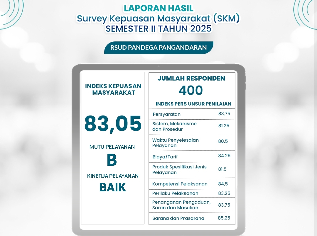 Berdasarkan hasil Survei Kepuasan Masyarakat (SKM) semester II tahun 2025, RSUD Pandega berhasil meraih nilai Indeks Kepuasan Masyarakat (IKM) sebesar 83,05 yang masuk dalam kategori Baik.