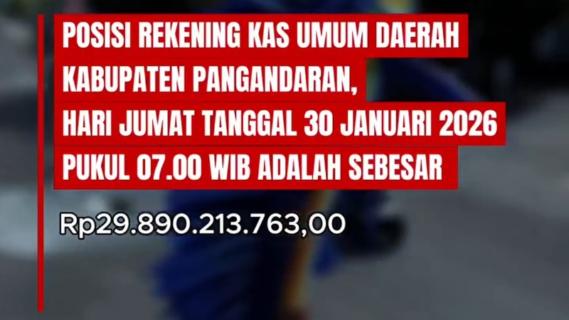 ​Berdasarkan laporan resmi per Jumat, 30 Januari 2026, pukul 07.00 WIB, saldo kas Pemkab Pangandaran tercatat berada di angka Rp29.890.213.763,00. Angka ini mencerminkan dinamika arus kas yang bersumber dari berbagai sektor pendapatan daerah serta realisasi belanja yang terukur.